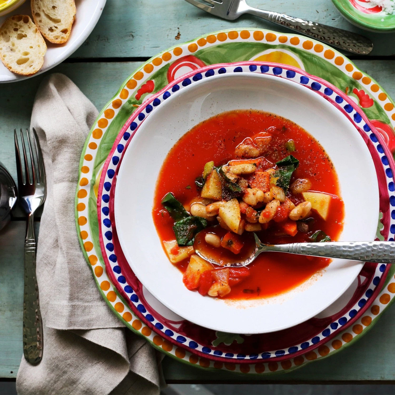 The Gallina Dinner Plate features whimsical handpainted roosters and is from our flagship dinnerware collection, Campagna.