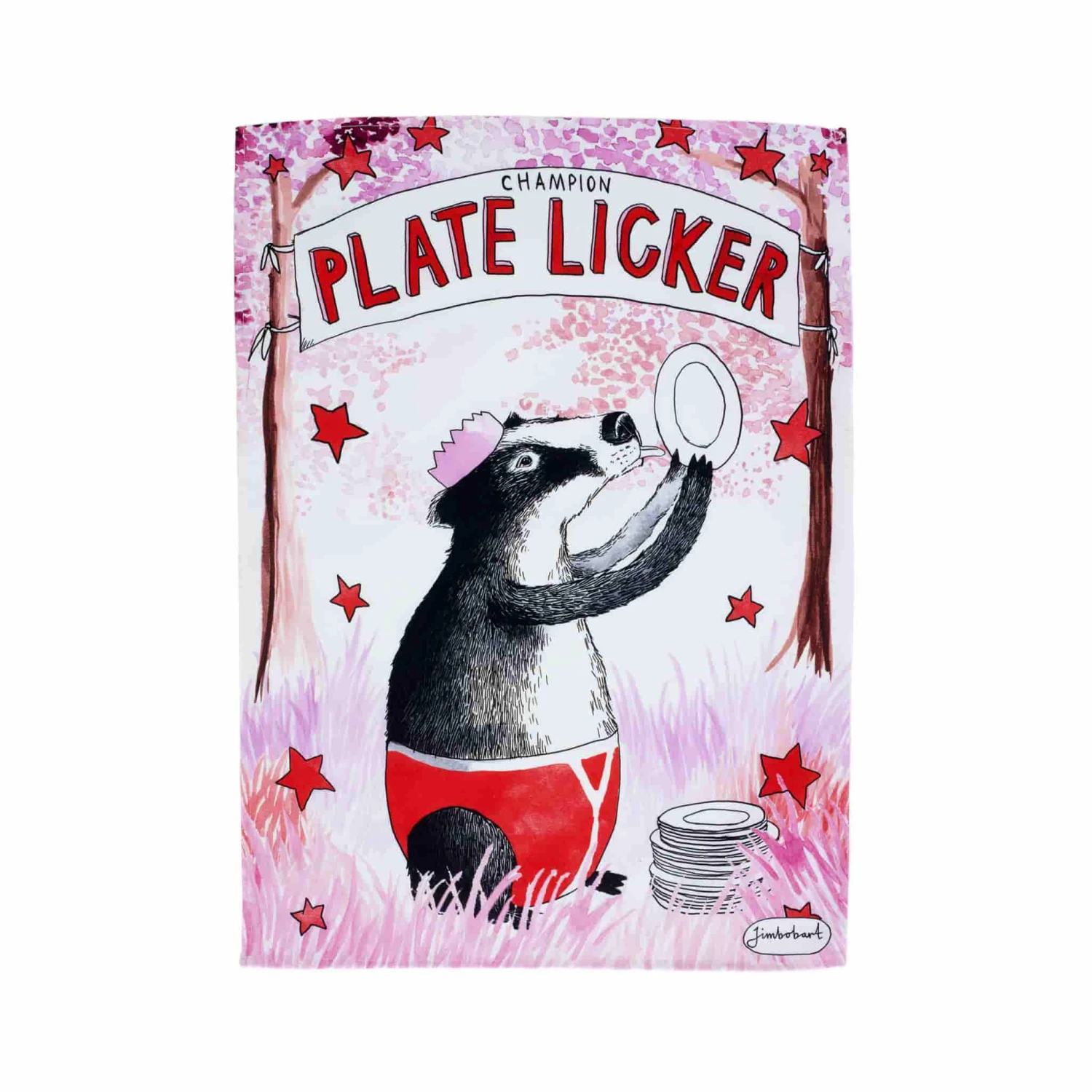 Jimbobart’s champion plate licker tea towel adds a playful touch to the kitchen chores. Made from 100% organic cotton and digitally printed in vibrant hues of pink and red, this tea towel dries dishes with ease and looks charming hanging by the sink. Decorated with a cheeky badger who prefers licking the plates to washing them, this kitchen furnishing will add a pop of colour to every space.