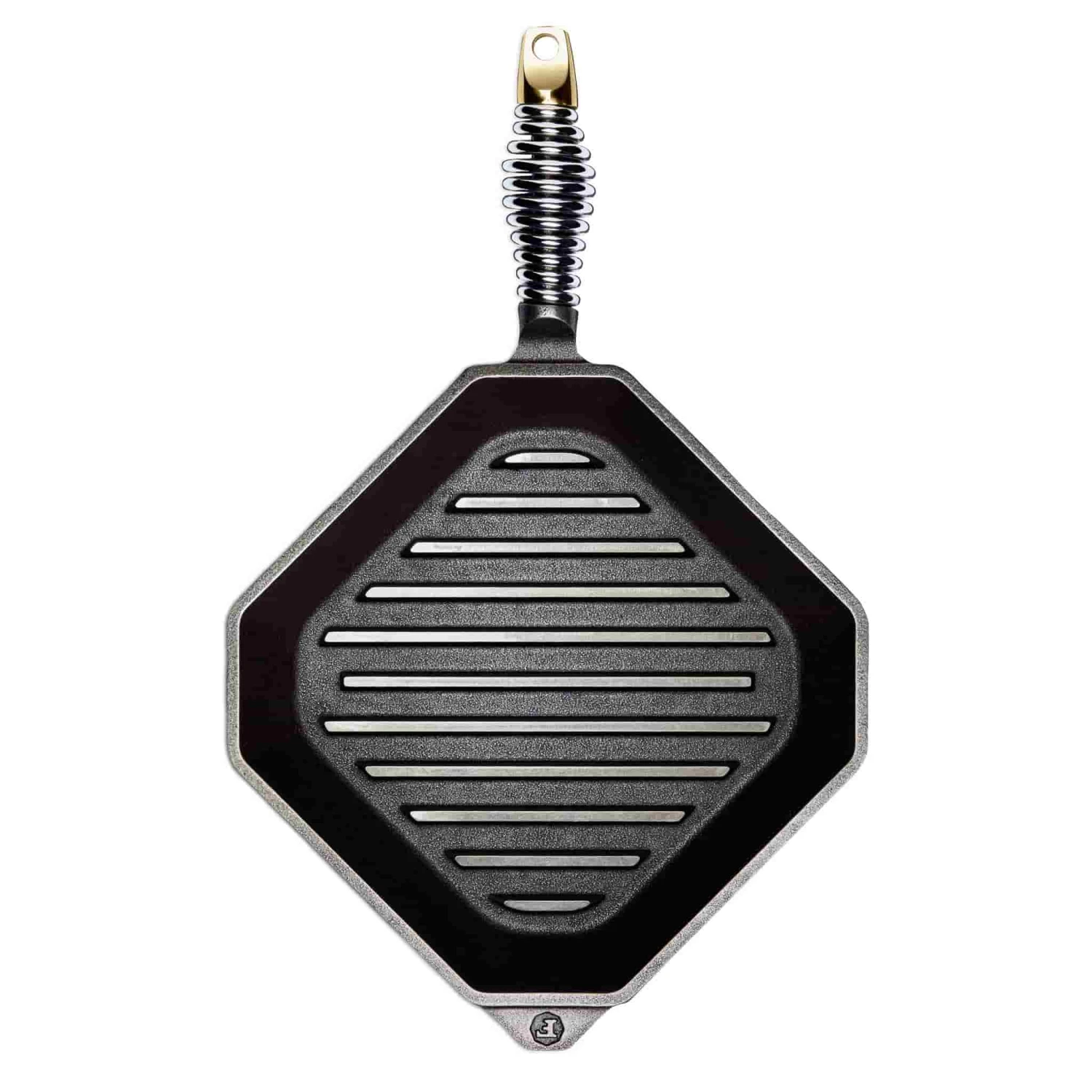 The pan features a unique diamond shape that makes it easy to pour away excess fat and juices. It also has a coiled stainless steel handle that stays cool while you grill so you can easily move it from your stove to a heat resistant mat on your countertop.