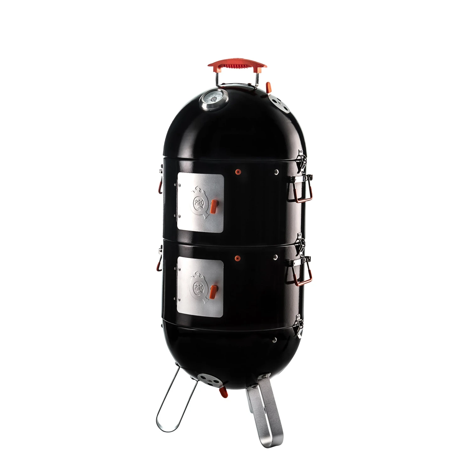 The ProQ Ranger Elite is well made and easy to use. Each compartment clips together, providing great stability, and making it easy to move. There is a temperature gauge at the top, four air vents, and eyelets at each level for maximum control throughout the cooking process. With a 35lb cooking capacity, you still have room to cook for a good number of guests – even hot smoking a few chickens at once!