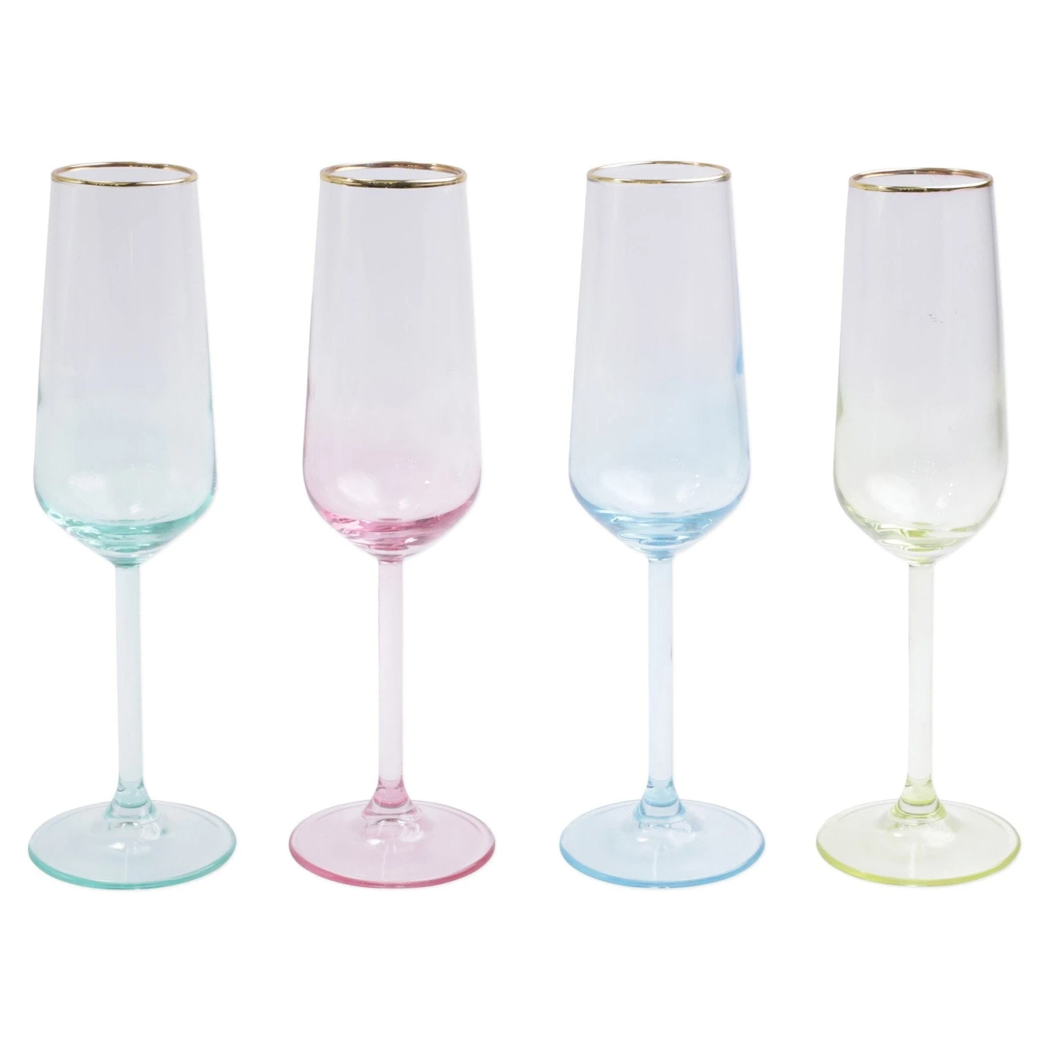 Add sparkle to any setting with a gilded gold rim and varied colored glass that refracts light on the Rainbow Assorted Champagne Flutes – Set of 4.