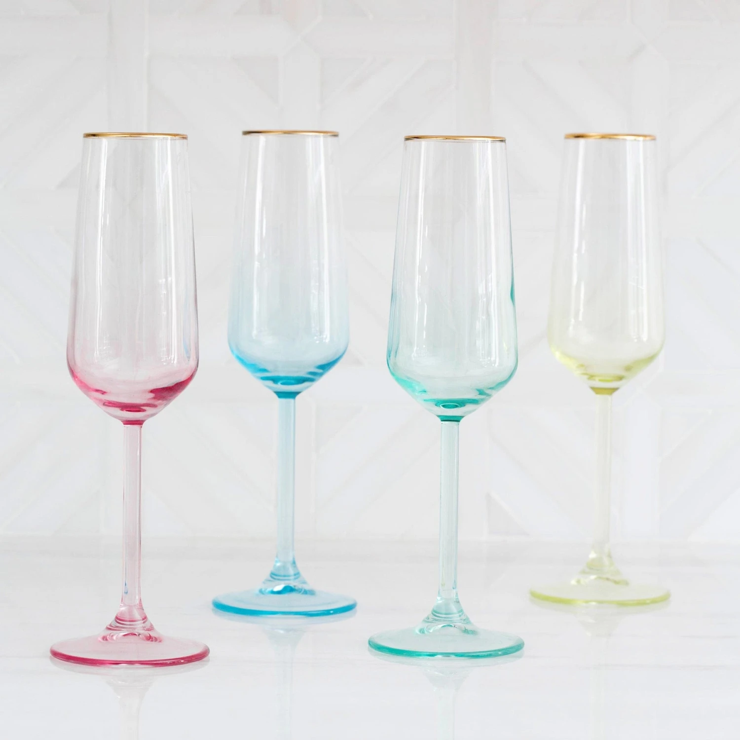 Add sparkle to any setting with a gilded gold rim and varied colored glass that refracts light on the Rainbow Champagne Flute.