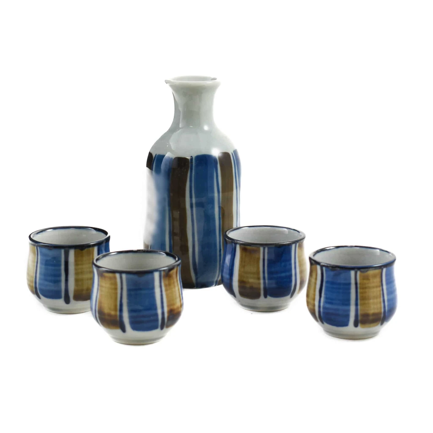 The Shima sake set is a stylish way to serve hot or cold sake with a Japanese meal. Handmade in Japan, the set includes a traditional flask (known as a ‘tokkuri’) and four small cups (known as ‘ochoko’). The ceramic flask and matching cups feature stripes of vibrant blue and earthy brown on a pure white background. (Shima means ‘stripe’ in Japanese.)